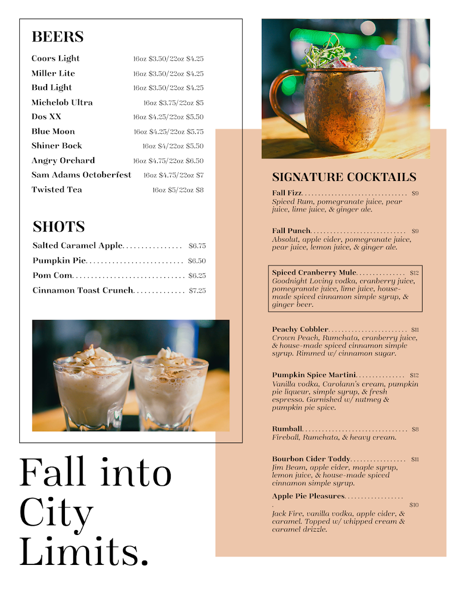 The menu at City Limits offers a relaxed blend of casual bites and comforting flavors, perfect for enjoying throughout the day and into the evening. Whether you’re stopping by for a laid-back brunch, grabbing a late lunch, or settling in for live music and drinks, the variety here suits many moods and moments.